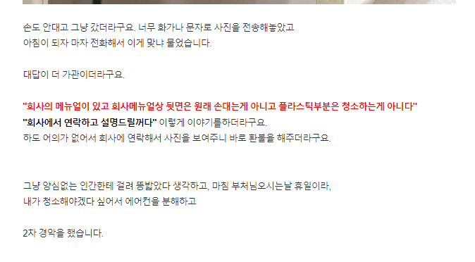 해당 기사는 “회사의 메뉴얼이 있고 회사메뉴얼상 뒷면은 원래 손대는게 아니고 플라스틱부분은 청소하는게 아니다”  “회사에서 연락하고 설명드릴꺼다” 라고 답했다고 전했는데요.