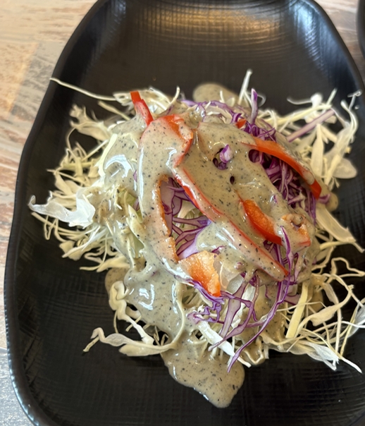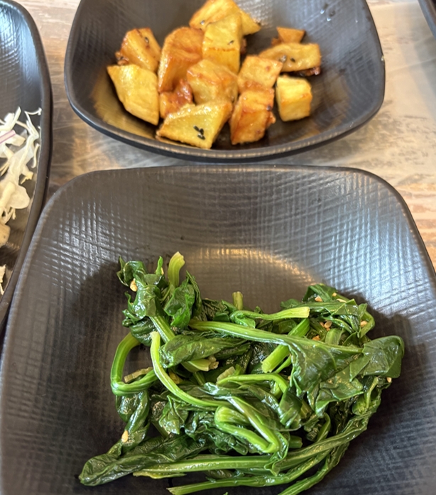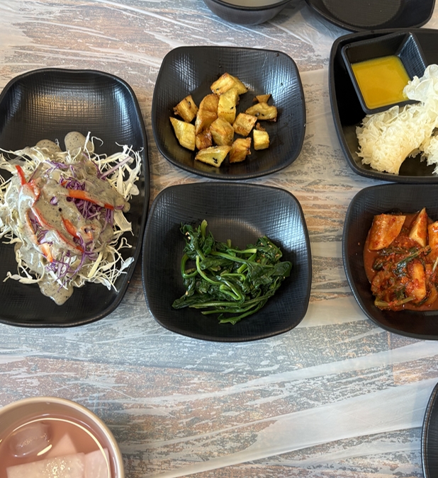 먼저 밑반찬이 인상적이었어요. 전체적으로 집밥을 먹듯이 간도 삼삼하고 맛있었는데, 보시다시피 샐러드와 시금치무침, 고구마맛탕, 해파리냉채?, 깍두기가 나오는데 전체적으로 맛있습니다.