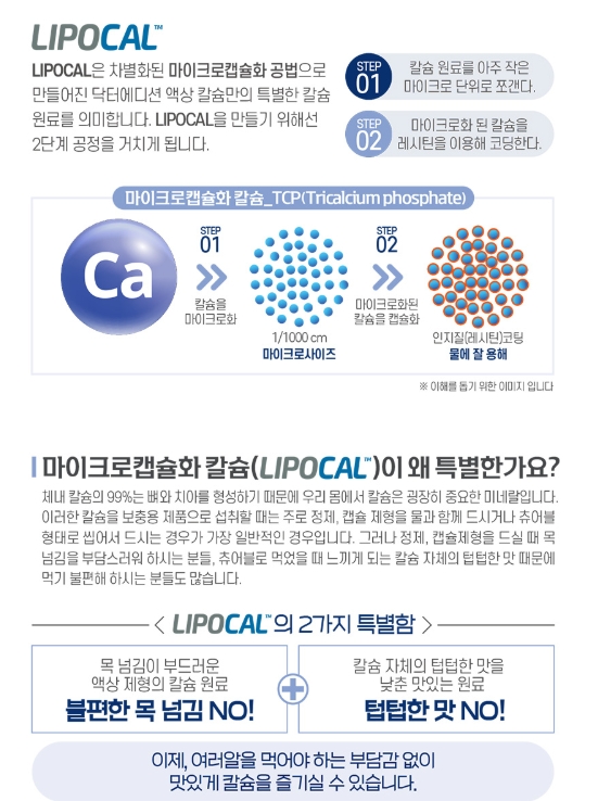 무엇보다 스페인산 칼슘에, 차별화된 마이크로캡슐화 공법으로 제조되었다고 하는데 칼슘을 레시틴과 전분으로 코팅한 형태로 칼슘이 텁텁한데 그 텁텁함을 잡은 제품이라고 이해하시면 됩니다. 😊
