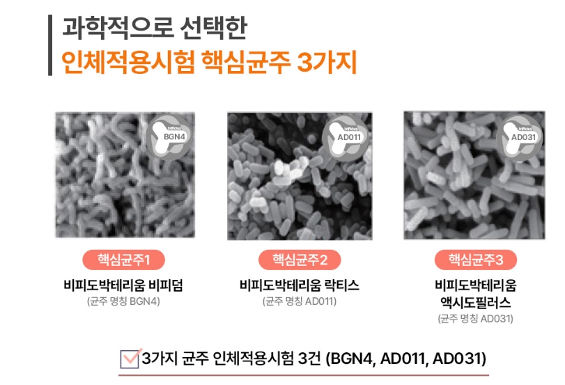 이미 과학적으로 검증된 인체적용시험 핵심균주 3가지로 알려져있어요.