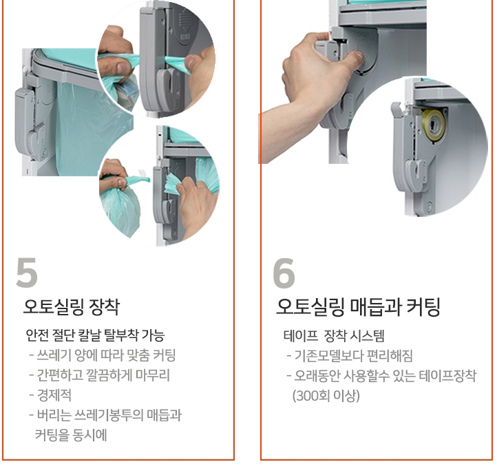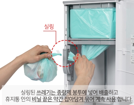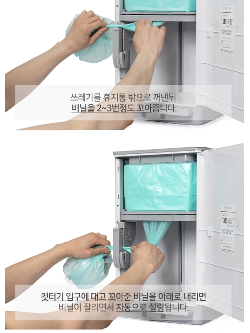 안전절단 칼날이라 쓰레기를 비우고자할때 아래처럼 비닐을 한두번 꼬아준뒤 칼날쪽으로 내리면 알아서 절단이되고, 테이핑이되면서 밀봉이 된다고 보시면됩니다.