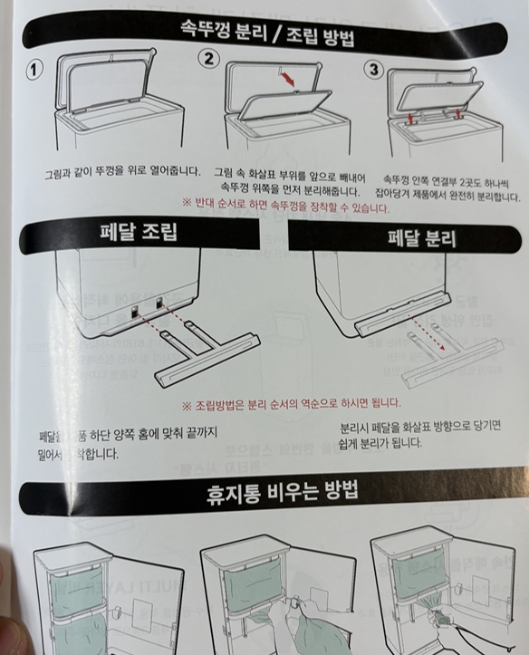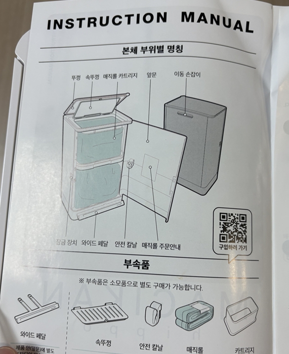 다들 매직캔 휴지통을 쓰는이유가 아래 설명서에도 있는데 4중으로 냄새를 차단하고, 원터치로 속뚜껑도 같이 열려서 편리하고 소음방지 시스템이라 열고 닫는데 소음하나 나지않는다는 장점이있어요.