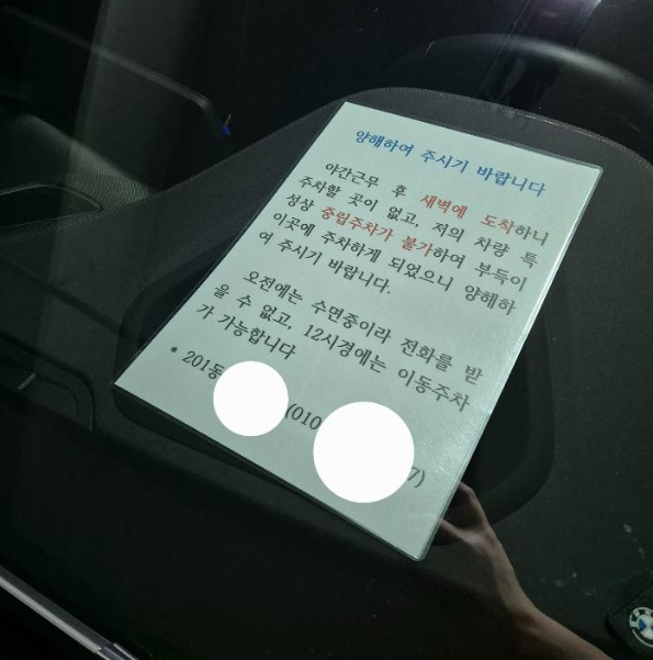 해당 차량은 외제차였는데, 특히 공개된 첫장 사진에는 “양해하여 주시기 바랍니다”라는 장황한 글이 적힌 메모지가 유리창 앞에 있었는데요.