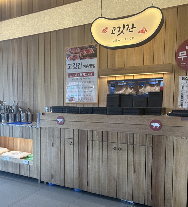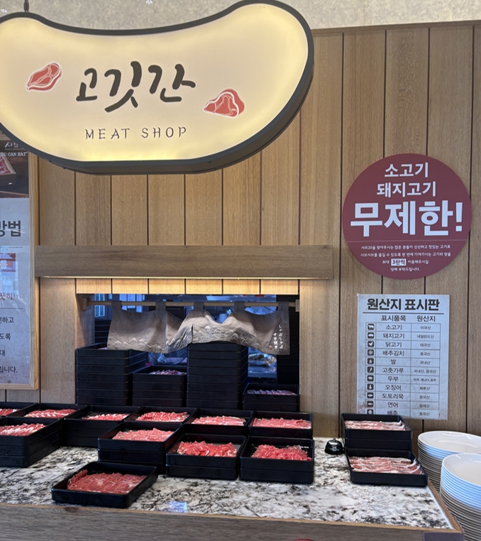 제가 앉은 바로 뒤편에는 고깃간이라고 해서 소고기와 돼지고기를 무제한으로 가져다 샤브샤브로 즐길 수 있는 공간이 있었구요.