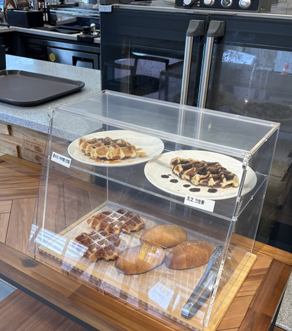 다음으로 보시면 모형으로 크로플도 전시되어 있었는데요. 가격자체도 합리적인데, 세트1 기준으로 10,000원인데 토스트와 소프트요거트 아이스크림이 나오더라구요.