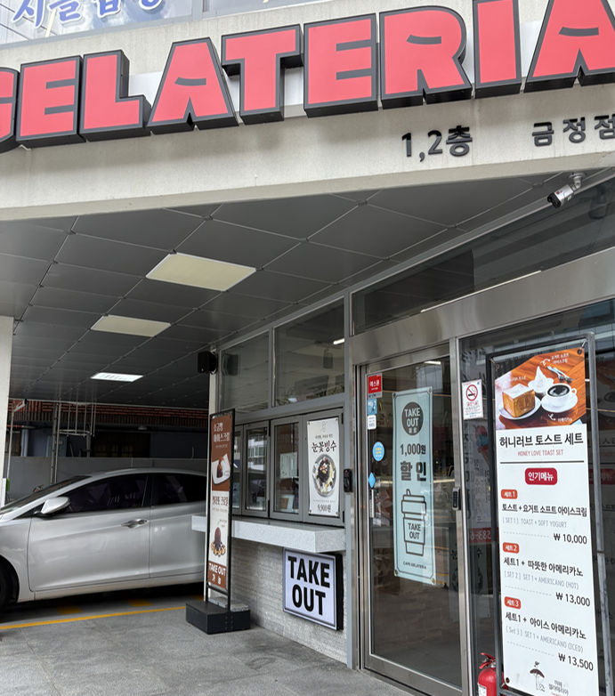 젤라떼리아는 멀리서 보시면 1층에 빨간색 글씨로 찾기쉽게 되어있어요.