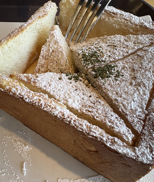 위에는 달달구리 슈가 파우더가 뿌려져있었고, 달달한 토스트와 따뜻한 커피한잔 곁들이니 너무 잘 어울렸어요. 😊
