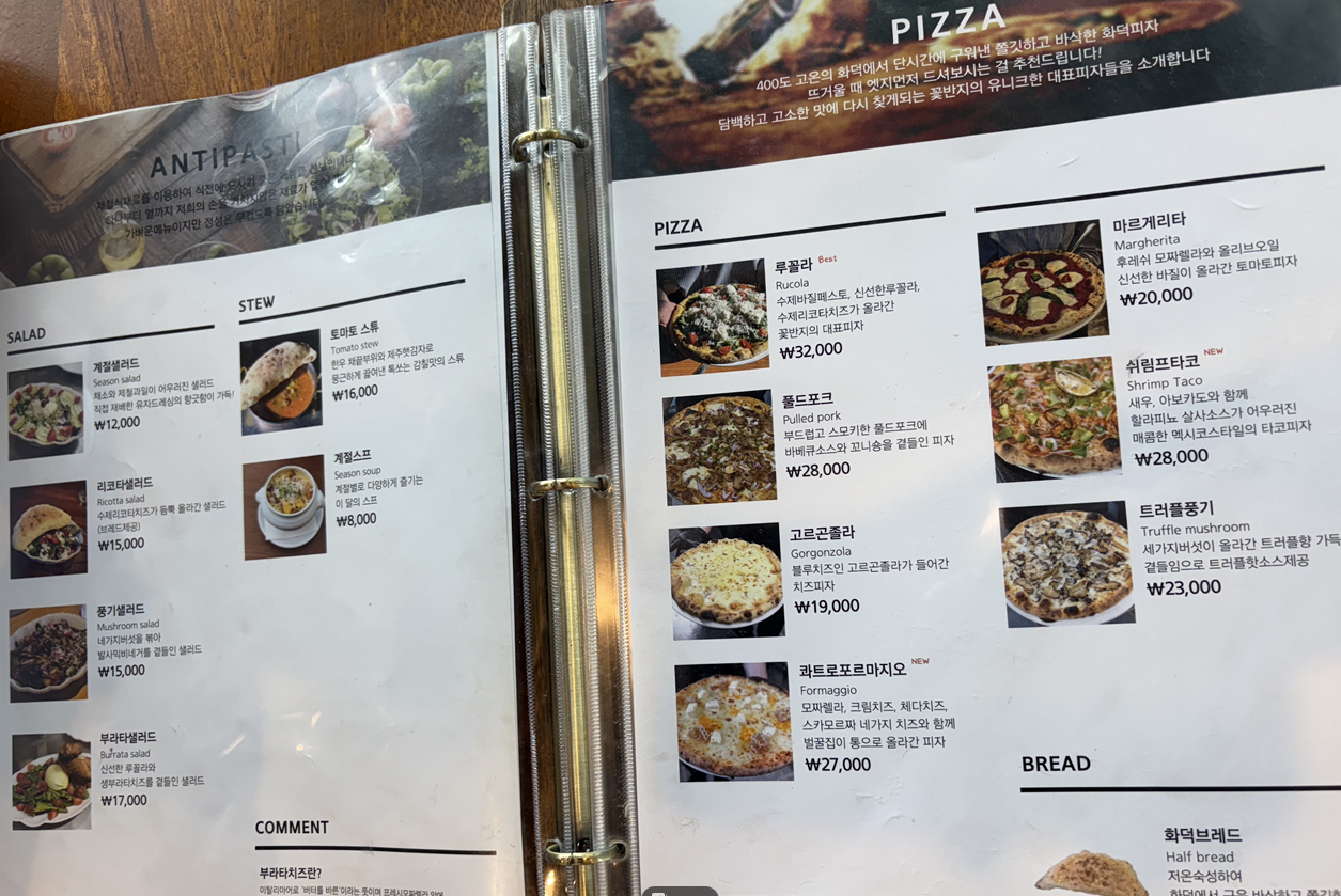 그리고 대망의 식사류는 샐러드와 스튜, 그리고 화덕피자 맛집으로 꼽히는 만큼 루꼴라부터 다양한 피자 종류가 있었구요.