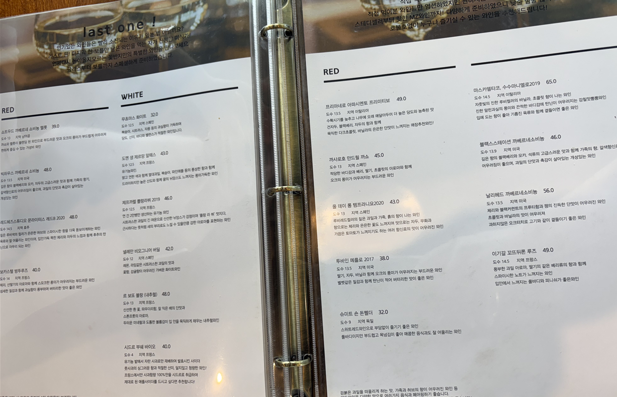 메뉴판이 자리에 있어 메뉴를 둘러보았습니다. 일단 뒷편에는 주류가 와인도 다양하게 구비되어 있었는데요.