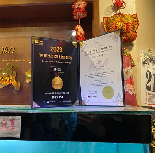 수족관 위에는 한국소비자산업평가에서 외식업부문 연속 우수상을 받은 상장도 걸려있었습니다.