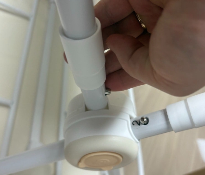 구성품으로 모빌과 휴지통, 세탁망 등을 받을 수 있다 설명드렸는데요. 아래는 우드모빌 설치된 사진이에요.