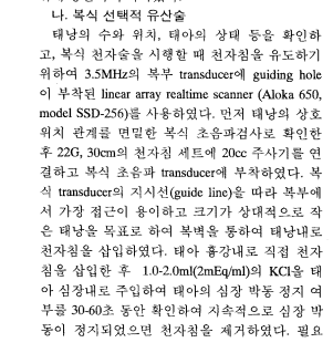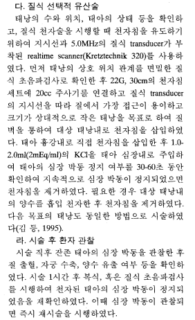 아래 연구논문과 동일하게 질식 초음파의 경우 질식 초음파 검사로 위치 확인 후 질벽을 통해 주사바늘이 삽입된 후 대상 태아 심장에 KCL, 즉 염화칼륨을 주입하여 심박이 멈추는것을 확인하게 됩니다.