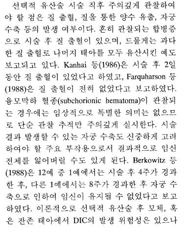 “본원의 연구 결과 선택적 유산술 시행에 따른 감염, 출혈, 시술의 실패 등의 합병증은 한 예도 없었으며47명 중 2명에서임신 8주와 19주에자연유산되어 쌍태아 모두 소실된 경우가 있었다”라고 이야기했는데요.