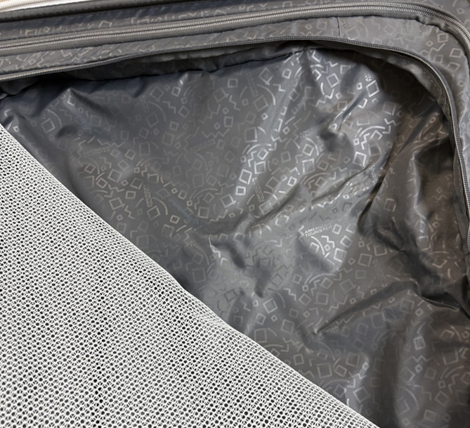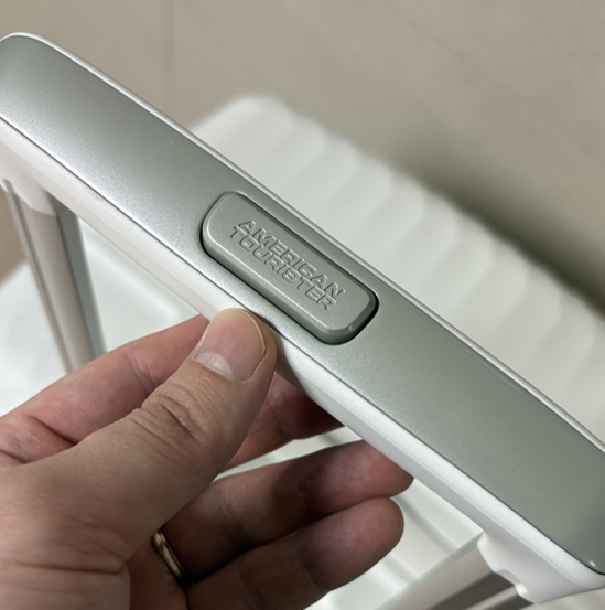 캐리어 겉에 새겨진 무늬도 고급스럽고 무엇보다 가운데 새겨진 브랜드 아메리칸투어리스터 각인이 굉장히 고급스럽습니다.