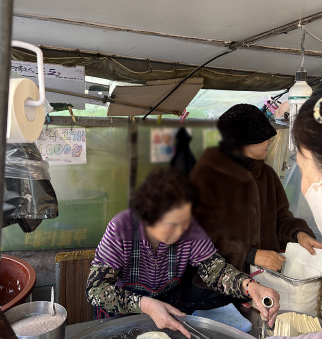 호떡을 할머니분이 구우시는데 손놀림이 예사롭지않은게 딱 3초만에 호떡 반죽을 만드셔서 버터가 있는 구이판에 순식간에 구워냅니다. 😁