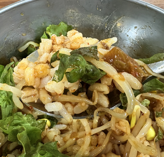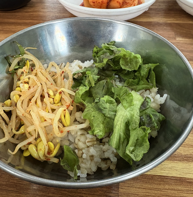 익혀진 김치와, 깍두기, 강된장, 그리고 상추와 콩나물이 들어간 보리밥이 한주먹 나옵니다.