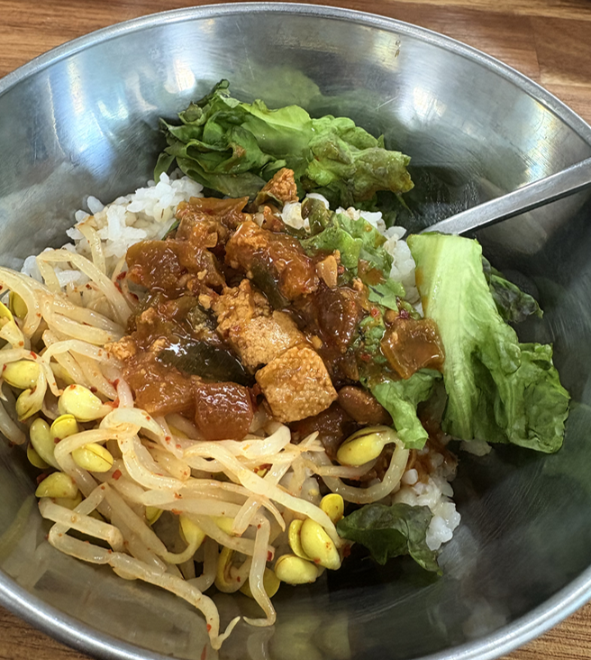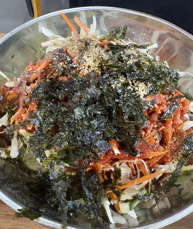 비빔은 야채가 특징인데, 김가루, 양배추, 당근 등이 푸짐하게 들어가고 마치 회비빔 같은 소스가 매콤하면서 달달해서 정말 맛있습니다.