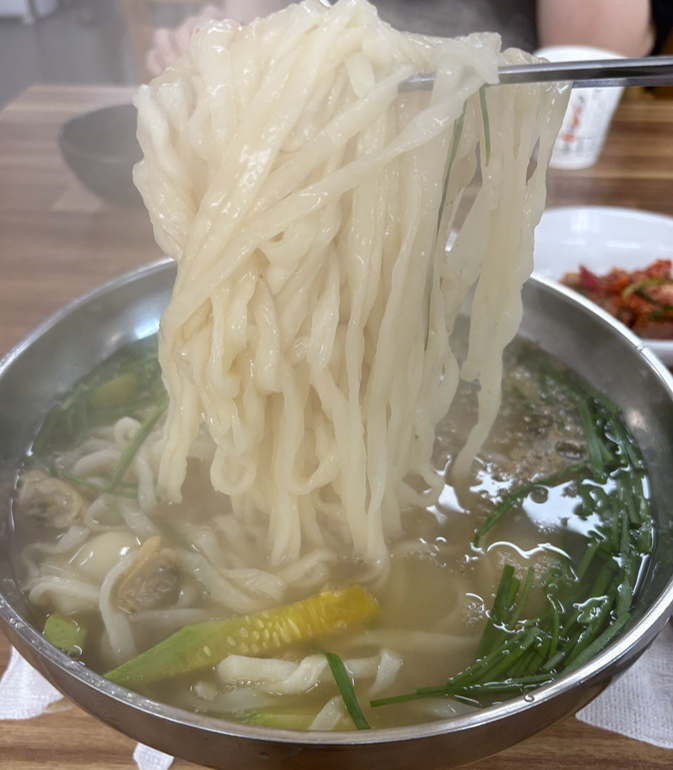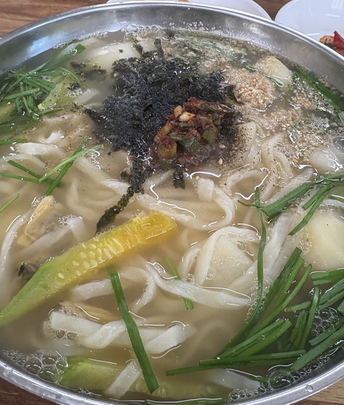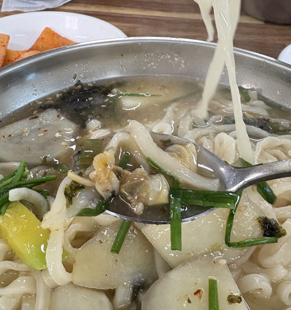 멸치 베이스 국물에 조개살이 엄청 많이 들어있고 감자, 부추, 김, 애호박 다양하게 들어있어서 배불리 먹을 수 있어요.