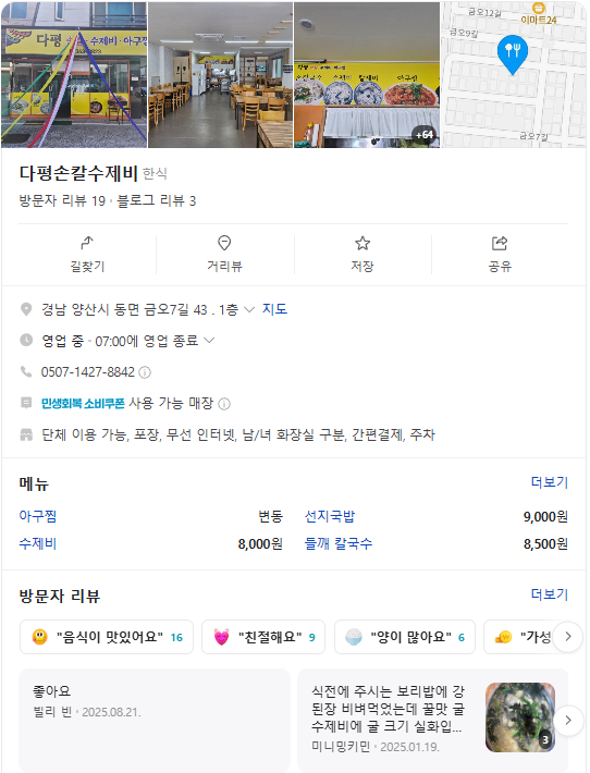 양산 동면 석산 택지에 위치한 칼국수 맛집 “다평손칼수제비” (+위치와 영업시간)