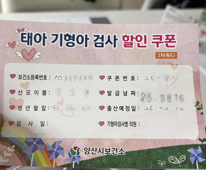 영양제가 가장 유용했고 기형아 검사 할인쿠폰은 양산말고도 부산에서도 사용가능하다고 하셨고 금액이 지원되는거니 꼭 지참하시는게 좋아요.