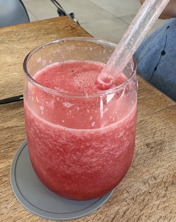 수박주스는 수박 과육을 그대로 갈아주셨는데요. 수박 과육도 통째로 들어있기도 하더라구요. 이게 덜 갈린건진 모르겠지만요.