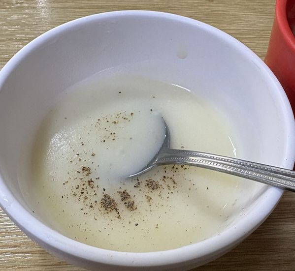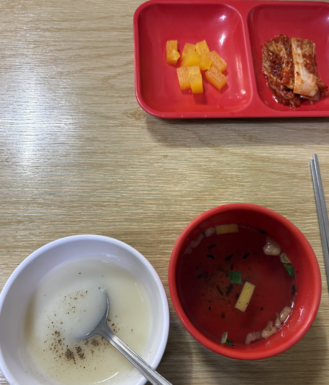 느끼할까봐 함께나온 찬들이 단촐합니다. 단무지와 잘익은 김치가 나오고 경양식 대표 스프와 우동국물이 나왔는데요.