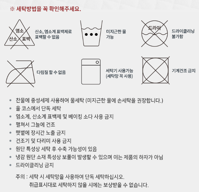 건조기 사용불가, 세탁망사용시 울세탁 코스로 사용가능한 제품 (+사진)