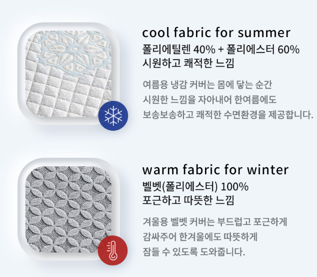 제품설명에 따르면 쿨면단은 폴리에틸렌과 폴리에스터 재질로 까슬한 느낌이 일품이고, 겨울용 면단은 벨벳 원단으로 부들부들하고 따뜻한 느낌이 들더라구요 😁