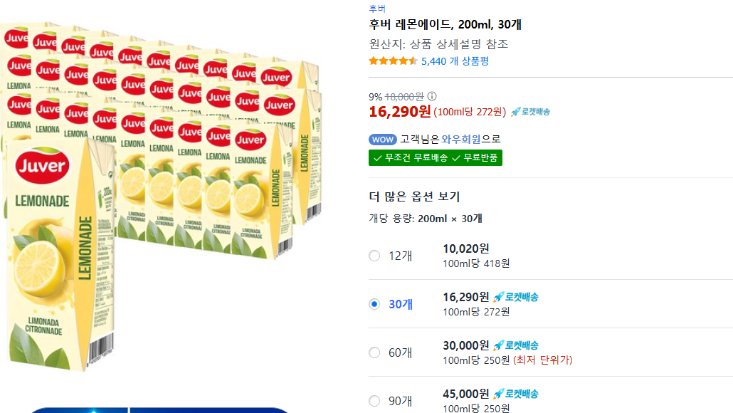 보시면 아시겠지만 쿠팡기준으로 200ml 30팩 기준으로 16,290원으로 개당 500원정도 꼴이었고 양도 꽤 많더라구요.