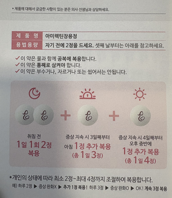 일반적인 임산부 입덧약 복용법과 동일하게 취침 전 2알을 먹고 다음날 증상이 심하면 오전 오후 각 한정씩 총 하루에 4알까지 섭취가 가능하다고 하셨습니다. 😊