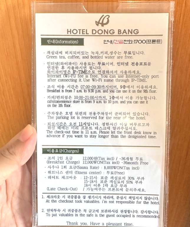 체크아웃은 11시까지 국룰이구요. 조식요금은 저렴한편으로 12,000원인데 여기 조식 맛있다는 평이 있었는데 따로 희망하지는 않았습니다. 😁