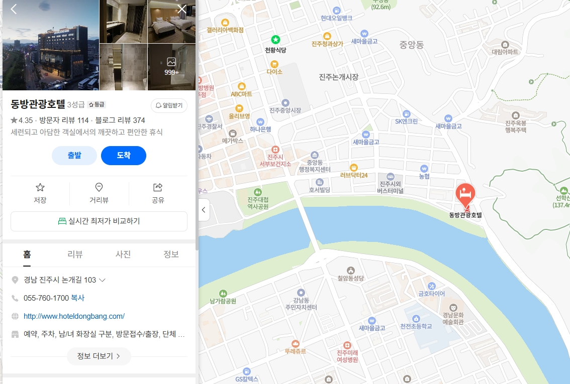 동방관광호텔은 경상남도 진주시 논개길 103에 위치해 있으며, 남강변 도심권에 자리하고 있어 산책이나 야경 감상에도 좋은데요.