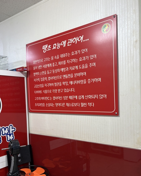 내부에는 중국집처럼 홀 좌석도 꽤 있어보이고 내부에는 땡초 효능에 대해서 간략하게 설명이 되어있습니다.