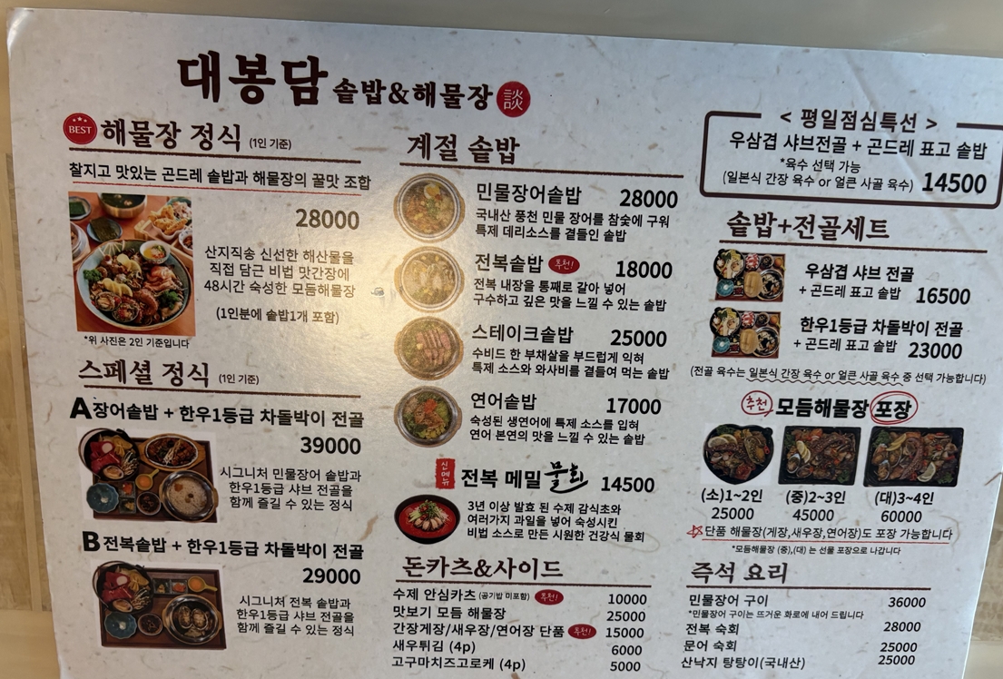 대봉담은 신선한 해산물과 다양한 솥밥 메뉴가 특징인 한식당으로 전복솥밥, 연어솥밥, 스테이크솥밥 등 다양한 솥밥과 함께 전복메밀물회, 우삼겹전골 등 푸짐한 메뉴가 인상적인 곳 중 하나인데요. 😁