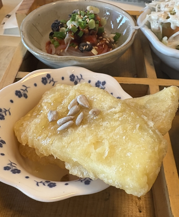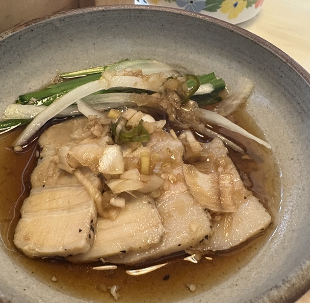 나온 밑반찬으로는 고구마튀김 2점과 표고버섯이 들어간 계란찜, 샐러드, 곤약무침, 삶은돼지고기가 나왔네요.