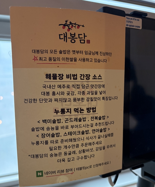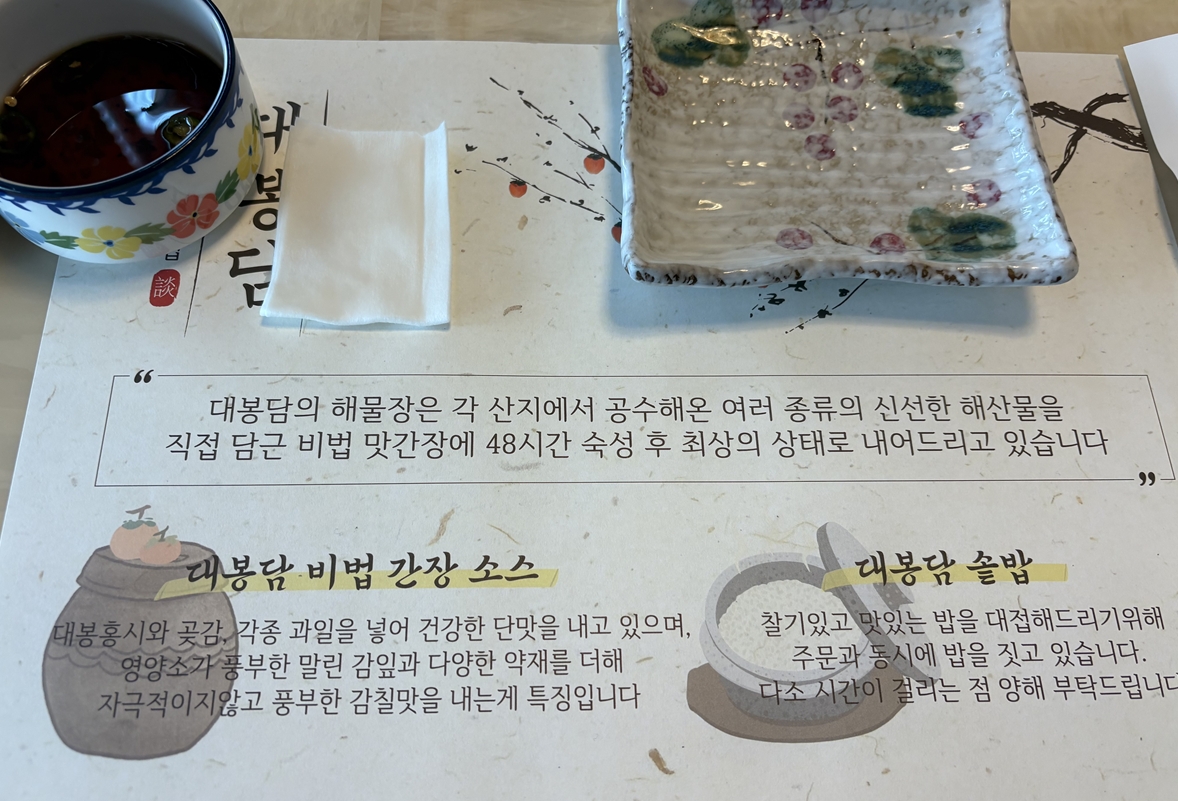 대봉담 모든 솥밥은 최고품질 이천쌀을 사용한다고 되어있고 해물장과 누룽지가 시그니처인것 같더라구요.