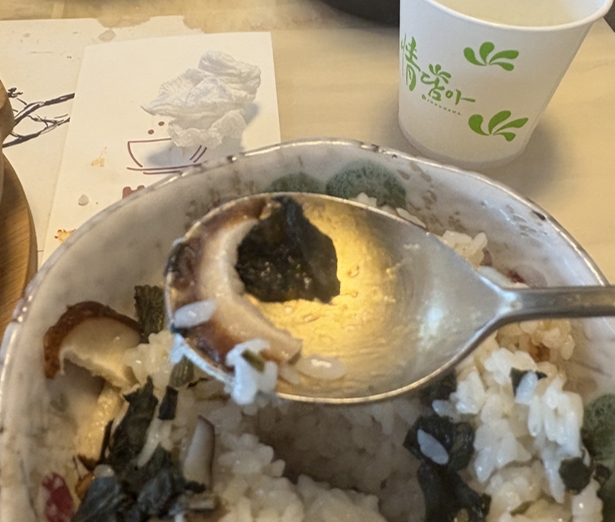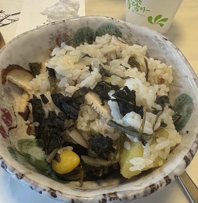 솥밥도 같이 나왔습니다. 안에는 곤드레밥이 따뜻하게 나왔는데 밥이 굉장히 찰지고 맛있었는데요. 곤드레와 표고가 가득 들어있어서 식감과 향이 좋았습니다.