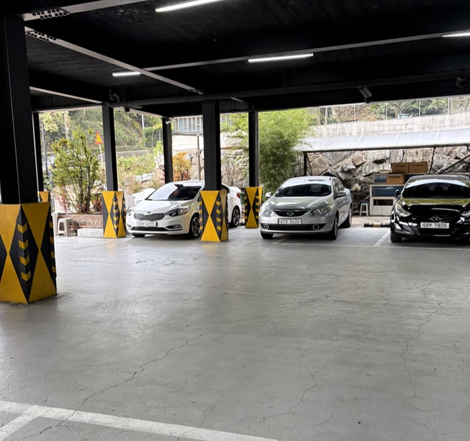 외관 건물은 1층 필로티까지하면 3층규모로 이루어져있는데요. 1층필로티는 주차장으로 구획이 나눠져있고 필로티에는 10대정도 주차가 가능해 보였습니다. 😁