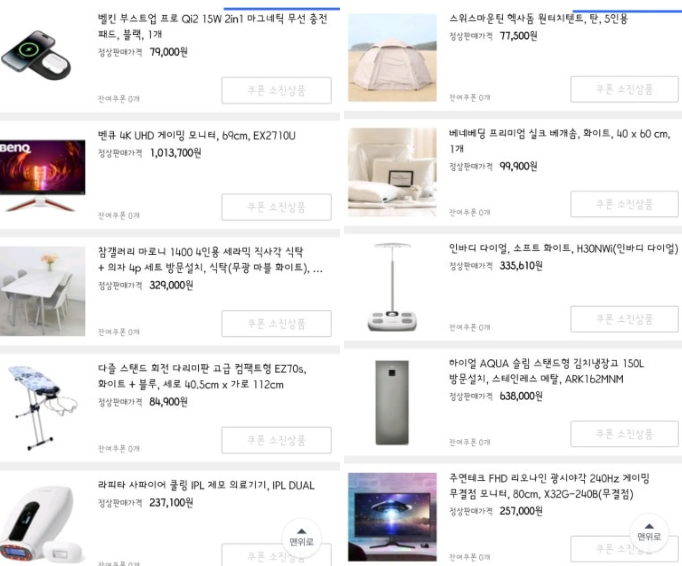 확실히 고가라인은 음식류가 아니라 생활용품이 많습니다. TV도 보이고 심지어 다른 분들은 안마의자도 뜬다고하는데요.