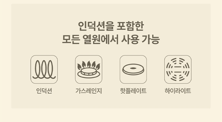 제가 구매한 요 제품은 아래처럼 인덕션 포함 모든 열원에서 사용가능하고 박스도 잘 포장되어 왔습니다.